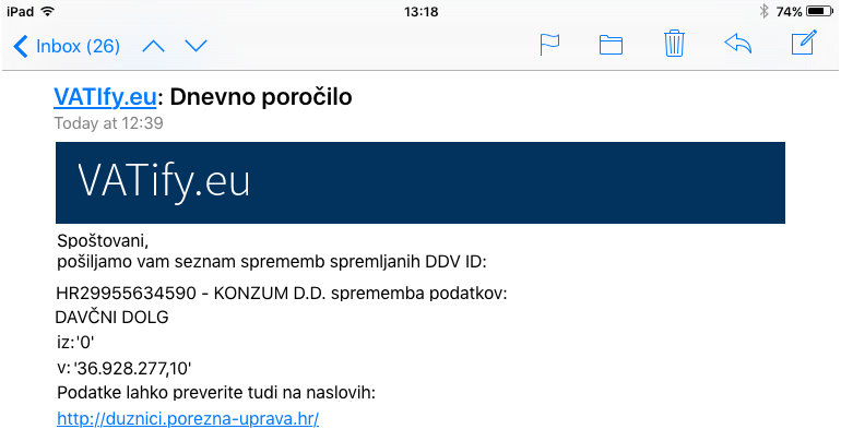 VATify.eu pošlje obvestilo le v primeru sprememb pri subjektih, ki jih spremljate. Informacije so združene v enem samem dnevnem poročilu, ki ga prejmete po elektronski pošti.