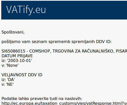 VATify.eu je storitev samodejnega spremljanja vaših poslovnih partnerjev z dnevnim osveževanjem podatkov, e-poštnimi opozorili ob spremembah in statusnimi poročili na zahtevo. Od vas ne zahteva niti uporabniških imen ali gesel niti nameščanja programske opreme. Vse prednosti...